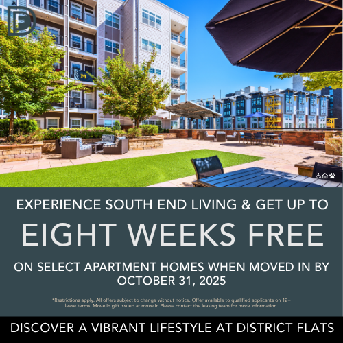 Discover the vibrant lifestyle at District Flats, located in the Historic South End of Charlotte. Renowned for its close proximity to the LYNX Light Rail and a plethora of breweries, restaurants, and entertainment options, our community offers large studio, one, and two-bedroom floor plans with ceilings ranging from 9 to 14 feet. Unwind by the saltwater pool, challenge friends at our outdoor gaming stations, or enjoy a movie in our entertainment theater. With a designer clubhouse and a fitness center, you'll have everything you need for pleasure and relaxation. Embrace boutique living at its finest.